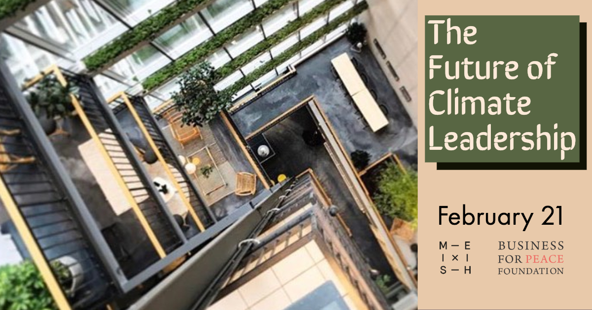 This year, Business for Peace has launched an afterwork series with MESH in Oslo. Following our first event, The Future of Cities, we’re happy to announce our second afterwork talk, The Future of Climate Leadership. During this conversation, we will explore what role businesses have to play in shifting the economy to avert impending crises caused by climate change. We will also address how businesses and civil society are working to reduce negative environmental impact and how they plan to take the lead in revolutionising our societies to be part of the solution.