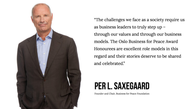Business for Peace is an international foundation based in Oslo that aims to support, inspire, and recognise global business leaders who are positively changing the face of business. At the centre of the Foundation’s activities is the annual Oslo Business for Peace Award, conferred to exceptional individuals who exemplify the Foundation’s concept of being businessworthy: ethically and responsibly creating value both for both business and society. An independent Award Committee, consisting of Nobel Laureates in peace and economics, selects the Award Honourees each year. The Foundation also hosts an annual Summit bringing together business leaders, investors, leaders of NGOs, politicians, academics, and civil society from all over the world to discuss the practical actions needed in order to make substantial and sustainable business contributions to society.